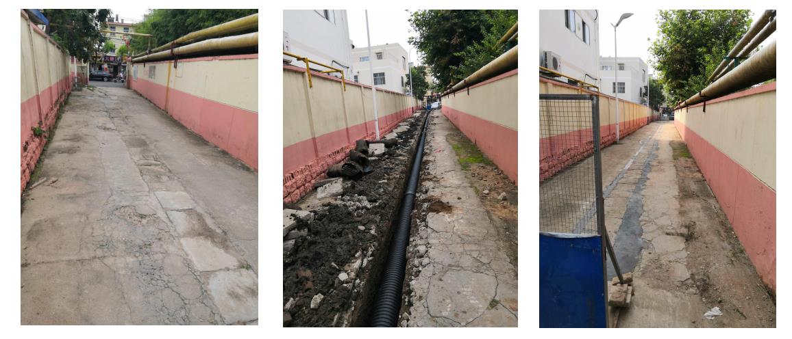 圖3:排污管道施工前、施工中、施工后