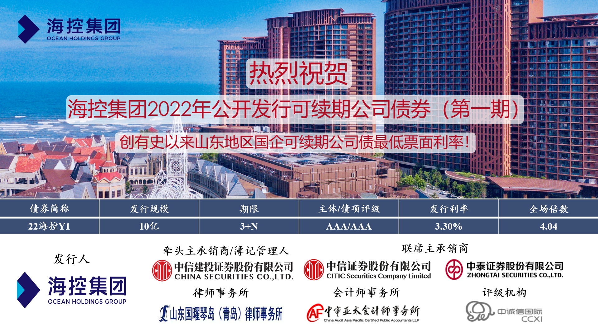 近日,海控集團“2022年公開發(fā)行可續(xù)期公司債券(第一期)”成功發(fā)行,期限3+N年,發(fā)行金額10億元,認購倍數(shù)4.04,發(fā)行票面年化利率3.30%,創(chuàng)有史以來山東地區(qū)國企可續(xù)期公司債券最低票面利率。
