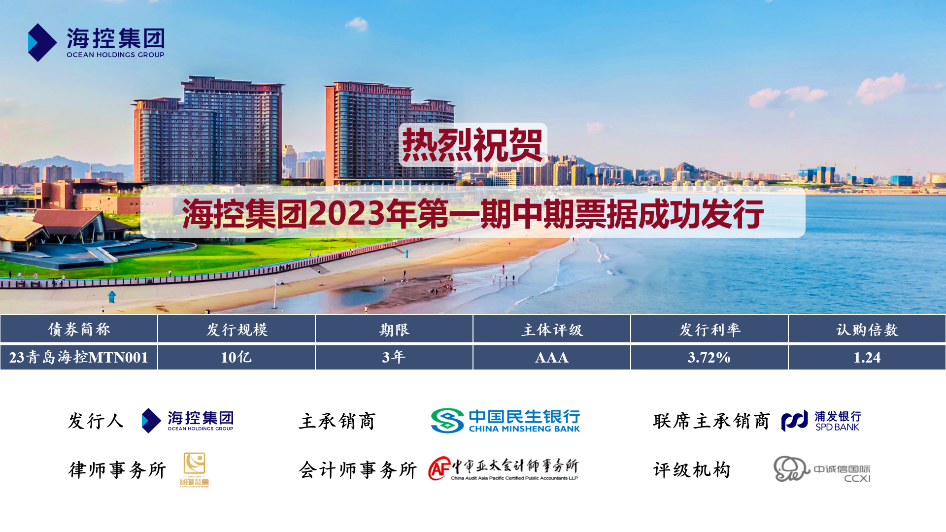 海控集團成功發(fā)行2023年第一期中期票據(jù),發(fā)行規(guī)模為10億元,票面利率3.72%,期限3年期,全場認購倍數(shù)1.24倍。