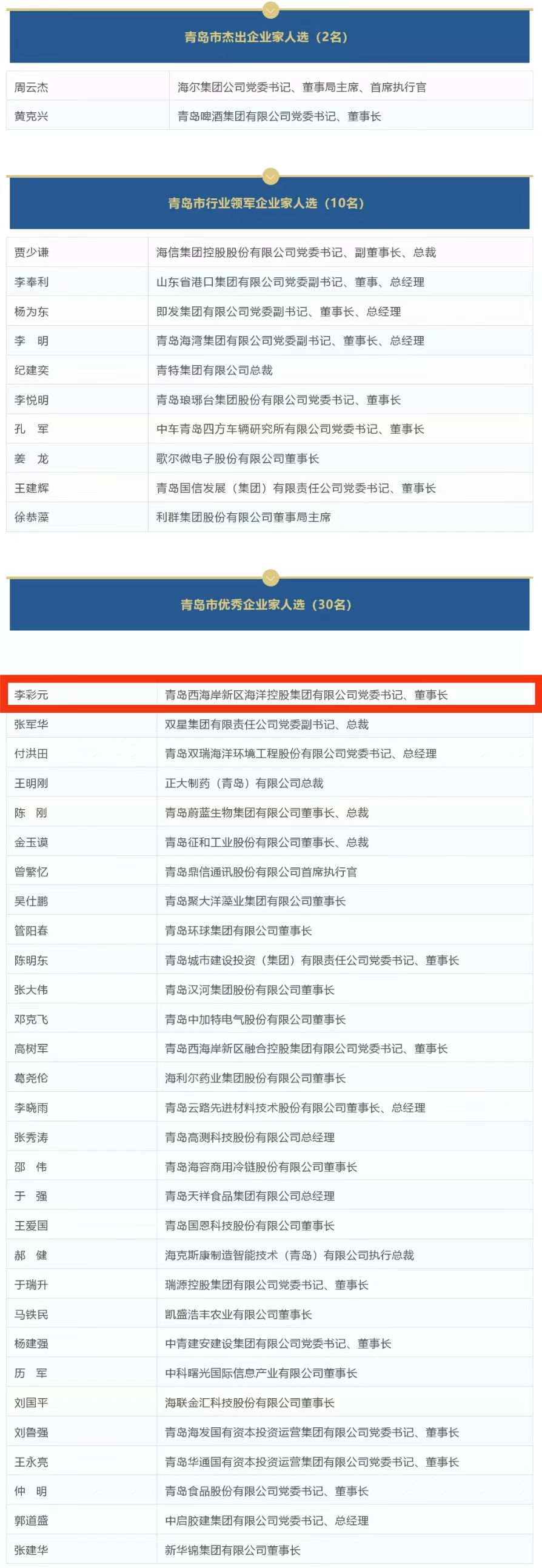 2022年度評選出的首批企業(yè)家中,“青島市杰出企業(yè)家”獲得者分別為海爾集團公司黨委書記、董事局主席、首席執(zhí)行官周云杰,青島啤酒集團有限公司黨委書記、董事長黃克興。