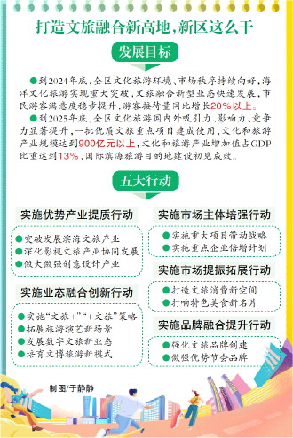 在發(fā)展目標(biāo)方面,《方案》明確提出,到2024年底,全區(qū)文化旅游環(huán)境、市場(chǎng)秩序持續(xù)向好,海洋文化旅游實(shí)現(xiàn)重大突破,文旅融合新型業(yè)態(tài)快速發(fā)展,市民游客滿意度穩(wěn)步提升,游客接待量同比增長(zhǎng)20%以上。到2025年底,全區(qū)文化旅游國(guó)內(nèi)外吸引力、影響力、競(jìng)爭(zhēng)力顯著提升,一批優(yōu)質(zhì)文旅重點(diǎn)項(xiàng)目建成使用,文化和旅游產(chǎn)業(yè)規(guī)模達(dá)到900億元以上,文化和旅游產(chǎn)業(yè)增加值占GDP比重達(dá)到13%,國(guó)際濱海旅游目的地建設(shè)初見(jiàn)成效。