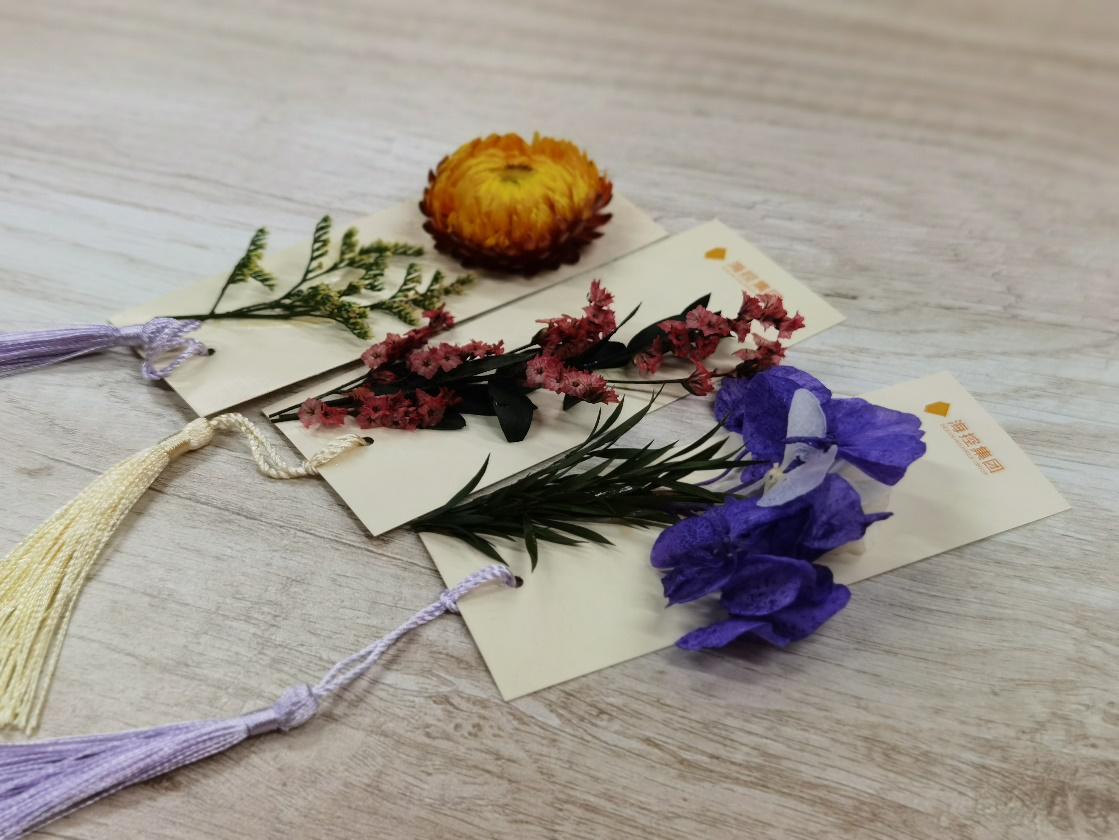 現(xiàn)場擺放有集團定制logo書簽、空白書簽、干花和各色馬克筆。在學習小組和文藝小組的帶領(lǐng)下,大家用手中的畫筆和工具,在書簽上揮灑著創(chuàng)意與靈感。
